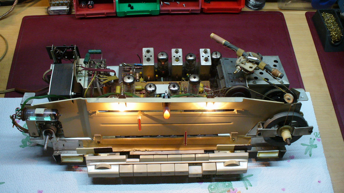 Gutes Kontaktspray, dosiert an alle elektronischen Kontaktschieber, Potentiometer und Röhrenpin´s. Harz und Säurefreies Öl auf die mechanischen Teile dosiert auftragen, vorher reinigen und von den alten Verharzungen befreien.