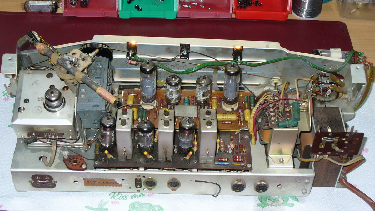 Zur Revidierung; Das übliche, Staub, altes festgebackenes Harz, defekte Birnen , der Selen Brückengleichrichter als defekt ausgetauscht, (original ungebraucht) , der Becherelko 2 x 100 µF/385 V, Ratiodedektor Elko 5 µf durch 4,7µ/35 V ersetzt.
