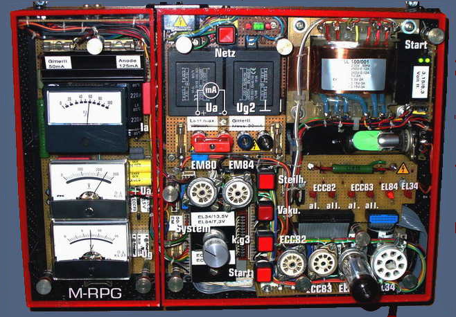 Mit dem "M-RPG" können Röhren wie EL 34, EL 84, die ECC 82, ECC83, EM 80 und EM 84 geprüft werden. Dies sind die Röhren, welche ich in meinen Vorgänger-Projekten eingesetzt habe. Der Grund zum Bau des Röhrenprüfgerätes war, dass etliche neue Röhren nach wenigen Betriebsstunden bis nahezu 50% ihre Leistung verloren hatten. Um die Funktion bei einer Wartung der Verstärker zu testen, hab ich mich entschlossen diesen Aufwand zu betreiben. Hatte auch schon länger vor, dieses Projekt zu realisieren. Im Aufbau der Schaltung habe ich mich an den Datenblättern dieser Röhren gehalten, die ausschließlich 250 Volt zum Messen benötigen. Auch die exakten Gittervorspannungen dieser Röhren lt. Daten-Blatt sind eingehalten. Nur so kann eine genaue, und ehrliche Leistungsermittlung erfolgen. Röhrenprüfgeräte die professionell aufgebaut sind, verfügen über mehr Messmöglichkeiten, bzw. können etliche Röhren mehr prüfen. Das war aber nicht mein Anliegen. Natürlich ist das hier vorgestellte Projekt nur ein "Abklatsch" der sonst industriell produzierten Geräte. Wie gesagt, seinen speziellen Ansprüchen soll es genügen, jedenfalls für meine Prüfzwecke. Meine entworfene Schaltung ist beliebig erweiterbar. Aus Platzgründen musste ich mich einschränken. Mein Anliegen war, dass so einfach wie möglich, eine Prüfung dieser Röhren machbar ist, auch für den Laien. System wählen, ein stöpseln und Messwerte ablesen, danach noch auf Knopfdruck verschiedene Funktionen testen - Fertig!