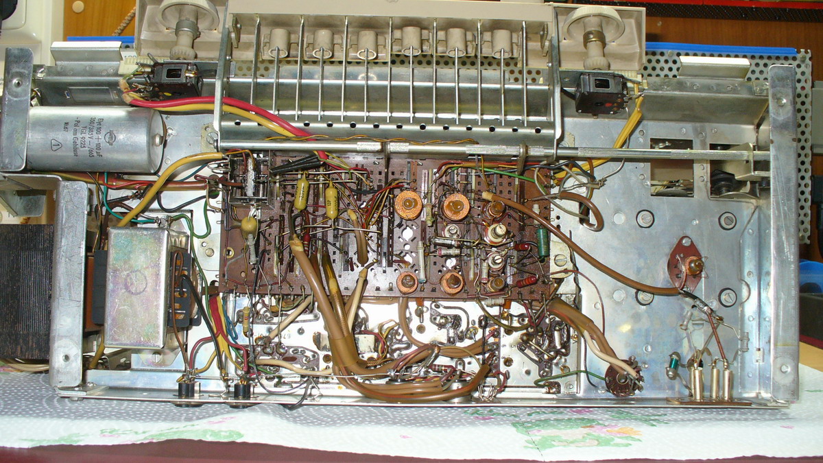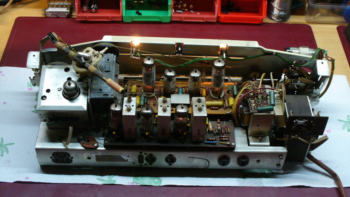 Zur Revidierung; Das übliche, Staub, altes festgebackenes Harz, defekte Birnen , der Selen Brückengleichrichter als defekt ausgetauscht, (original ungebraucht) , der Becherelko 2 x 100 µF/385 V, Ratiodedektor Elko 5 µf durch 4,7µ/35 V ersetzt.